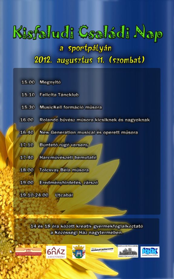 Augusztus 11-én szombaton 15 órától a Kisfaludi Közösségi Házban és környékén Családi Napot tartanak, a rendezvényre szeretettel várnak minden érdeklődőt. A programok között helyet kap majd musical és operett előadás, de lesz táncklub, bűvész műsor, harcművészeti bemutató és ötpróba is az olimpia jegyében. Az rendezvényt este utcabál zárja. A Családi Napon kreatív gyermekfoglalkoztató is lesz a Kisfaludi Közösségi Ház nagytermében.