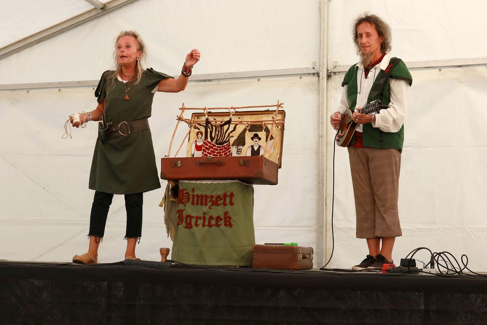 A vásári mesemondó duó olyan interaktív történeteket talált ki, amelyekben a gyerekek együtt zenélhetnek velük, sőt, a mese alakulásába is beleszólhatnak. A mesélők 15. századi ruhába bújnak, hogy középkori hangulatot teremtsenek, amelyet a mandolin és a csörgő hangja erősít. A díszlet egy régi bőrönd, ebből kerülnek elő a történetek gondosan hímzett szereplői.