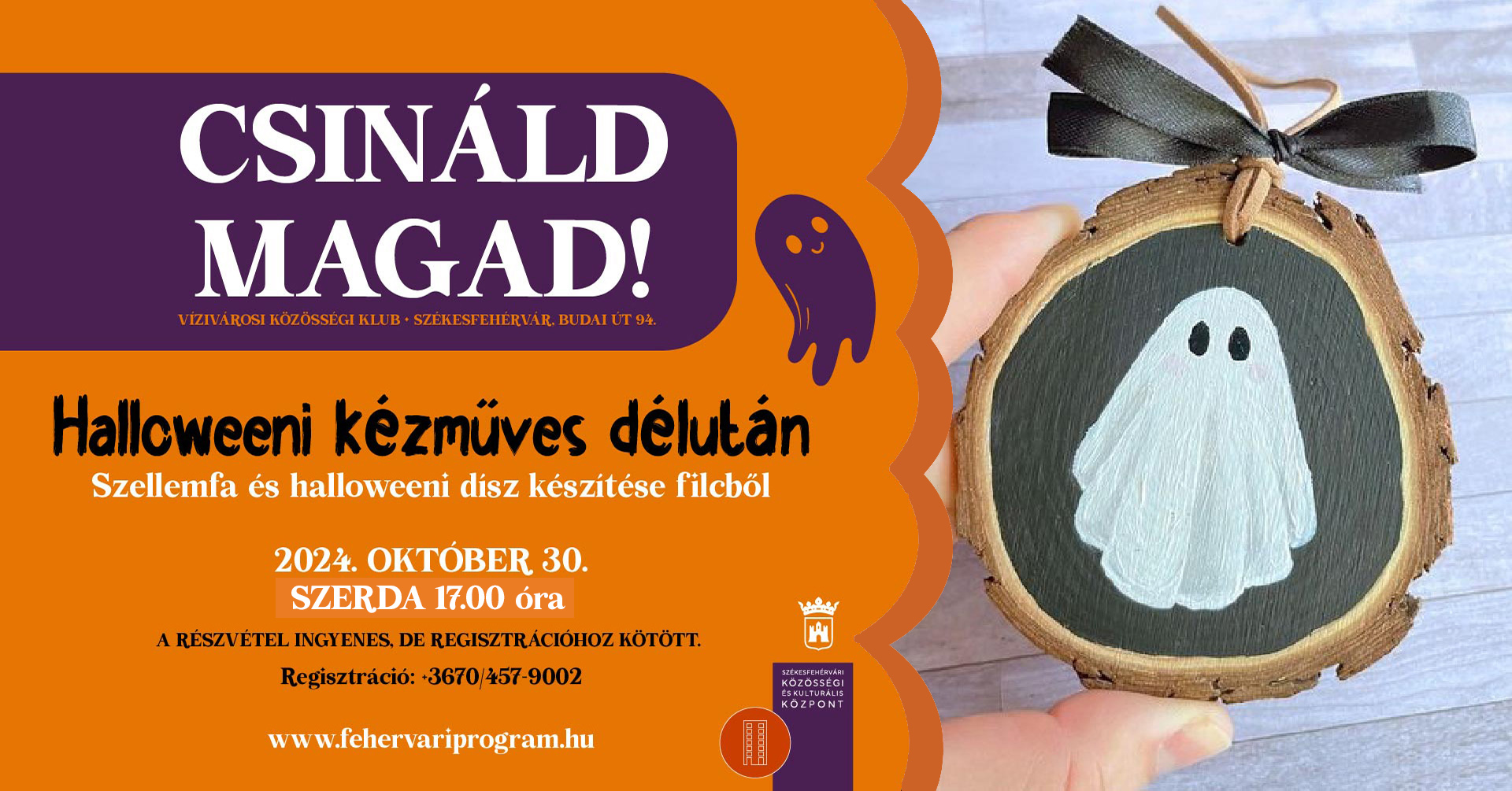 Az október 30-án, szerdán délután ötkor kezdődő ingyenes workshopon az ősi kelta ünnep jellegzetes figurái közül kettőt, szellemfát és filctököt lehet készíteni. Az SZKKK az alapanyagokat és a szükséges eszközöket biztosítja, a résztvevőknek csak a fantáziájukat kell magukkal hozniuk. A foglalkozásra előzetesen regisztrálni kell a +3670/457-9002-es telefonszámon.