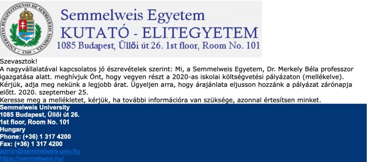 Adathalászok élnek vissza a Semmelweis Egyetem nevével. Egy költségvetési pályázaton való részvételre hívják meg csalók a Semmelweis Egyetem nevében a címzetteket.