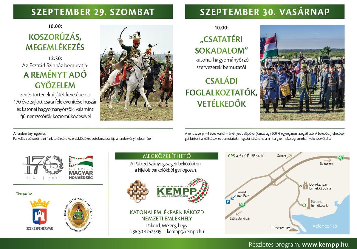 Szeptember 29-én Dr. Gyuricza Béla vezérezredes emléktáblájánál lesz megemlékezés, majd a Honvédfesztivál kiemelt eseményeként zensé történelmi játékot mutatnak be a Pákozdi Katonai Emlékparkban az Esztrád Színház, valamint a Magyar Huszár és Katonai Hagyományőrző Szövetség előadásában.