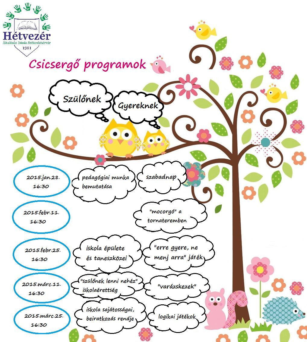 Ismét megrendezi a „Csicsergő klub” iskolába hívogató programsorozatát a Hétvezér Általános Iskola. Az első foglalkozást 2015. január 28-án, szerdán 16.30 órától tartják, melyen az intézményben folyó pedagógiai munkáról tájékoztatják a szülőket. Februárban és márciusban két-két alkalommal, szintén szerdai napokon folytatódik a Csicsergő Klub.
