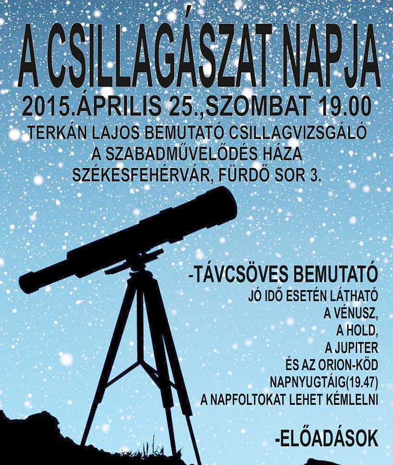 Magyarországon is viszonylag régi hagyománya van a Csillagászat Napjának. 2015-ben április 25-én előadásokat, távcsöves bemutatókat tartanak országszerte az érdeklődőknek. Ebből természetesen a fehérvári csillagda sem maradhat ki, ahol 19 órától várják a látogatókat a Fürdő sor 3-ban. A Csillagászat Napja „mozgó ünnep”, mely a holdfázishoz igazodik, általában az első negyedhez legközelebbi szombatra esik. Ezen a szombat estén a Hold majdnem első negyedben lesz, kísérőnkön kívül a Vénusz és a Jupiter lesz az este legfőbb látványossága.