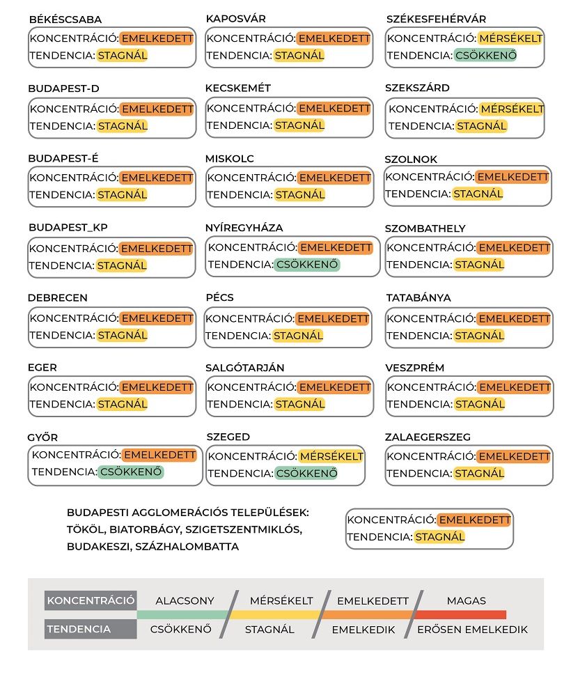 Hozzátették: az országos átlagkoncentráció továbbra is jelentős. A koncentráció egyik vizsgált városban sem nőtt, csökkenést tapasztaltak négy városban: Győrben, Nyíregyházán, Szegeden és Székesfehérváron. A mintavételi helyek többsége - 19 helyszín - az "emelkedett" kategóriába, míg három város - Székesfehérvár, Szekszárd, Szeged - a mérsékelt kategóriába sorolható.