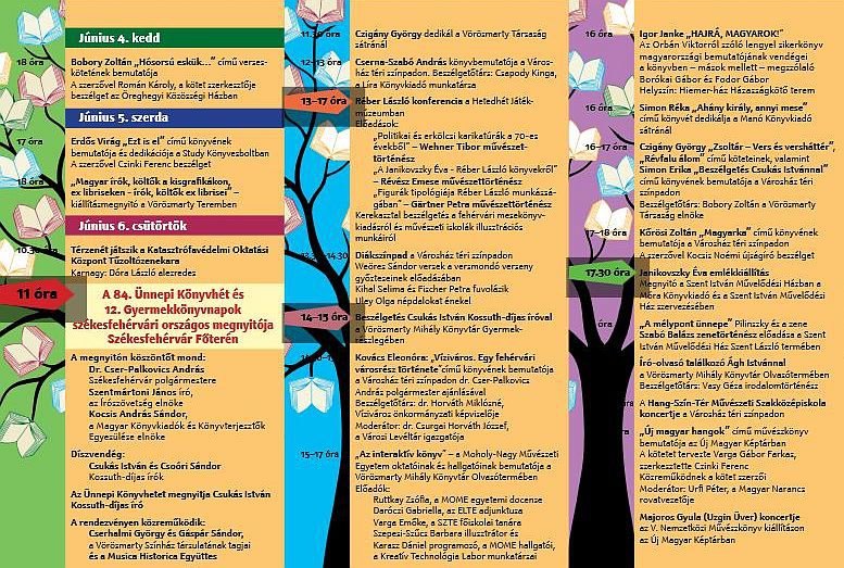 Az idei évben Székesfehérvár ad otthont a 84. Ünnepi könyvhét és 12. Gyermekkönyvtárnapok országos megnyitójának június 6-án 11 órakor a Városház téren. A könyvhét alatt a városba látogat a magyar irodalom színe-java, többek között Csukás Istvánnal, Csóri Sándorral, Esterházy Péterrel és Czigány Györggyel is találkozhatnak az irodalom kedvelői.