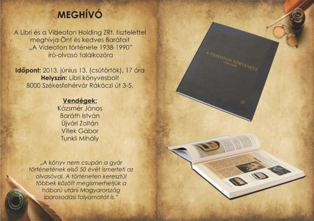 Csütörtökön délután öt órakor író-olvasó találkozót szerveznek "A Videoton története 1938-1990" című könyv megjelenése alkalmából a Skálában található Libri könyvesboltban. A kötetet a gyár 75 éves évfordulójára jelentették meg és nemcsak a Videoton első ötven évét, hanem a háború utáni Magyarország iparosodási folyamatát is ismerteti.