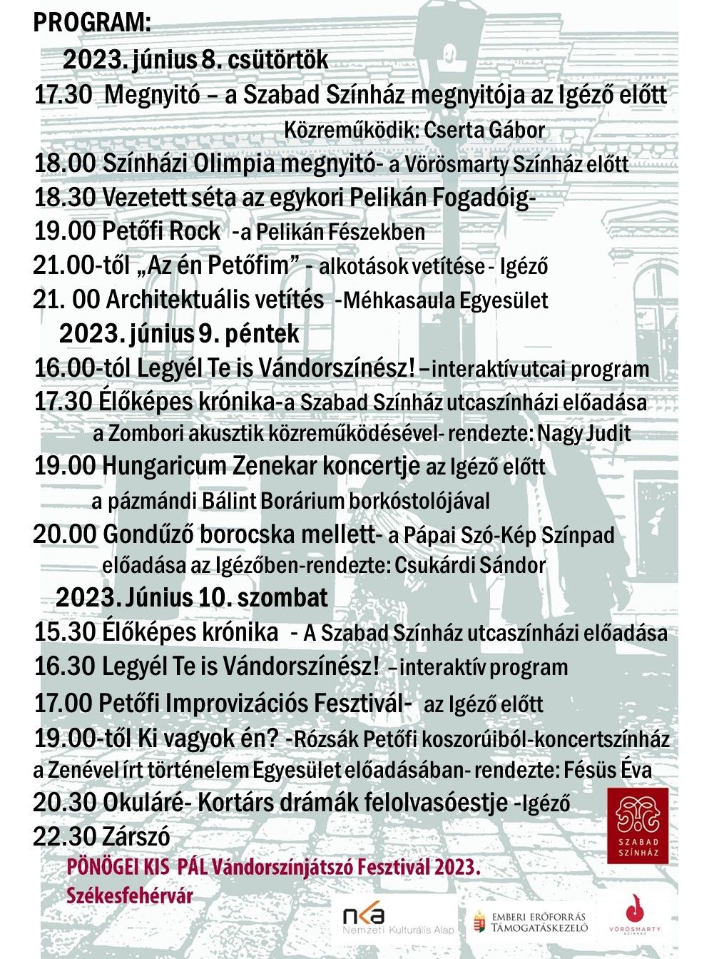 A Szín-TÉR Egyesület a Vörösmarty Színházzal karöltve Fejér megyei és Székesfehérvár határon túli testvérvárosaiban élő diák- és ifjúsági csoportokat hívott meg, hogy Petőfi évben létrehozott színművek feldolgozását, rövid átiratait hozzák el, színpadi, illetve előadói műfajok határterületeit feszegető produkciók formájában – pénteken és szombaton este ezen darabok szereplőivel is találkozhat a fehérvári közönség a Pönögei Kis Pál Vándorszínjátszó Fesztiválon.