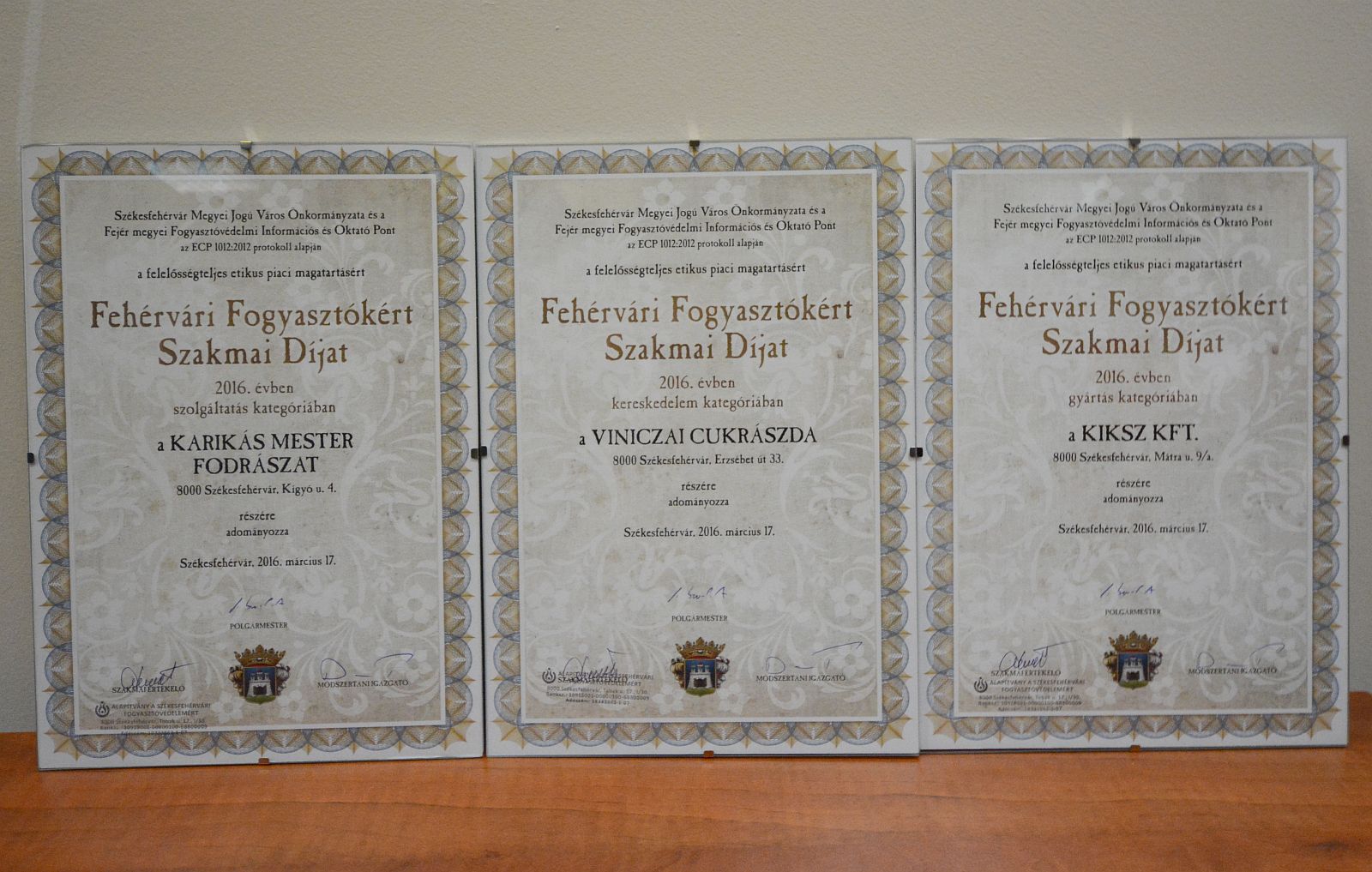 A kereskedelem, a szolgáltatás és a gyártás területén választottak ki egy-egy fehérvári vállalkozást, amely a profitszerzés mellett a társadalmi haszonra is figyel, vagyis etikus piaci magatartást tanúsít. A Fehérvári Fogyasztókért Szakmai Díjjal kitüntetett vállalkozások között van a Viniczai Cukrászda, a Karikás Mester Fodrászat és a szerszám és alkatrészgyártással foglalkozó KIKSZIpari, Kereskedelmi és Szolgáltató Kft. is.