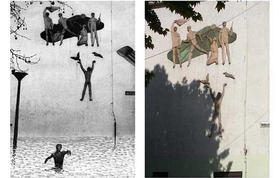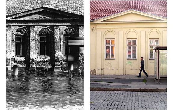 Az időtlenség érzését minduntalan megzavarja, hogy képről képre, stációról stációra haladva bekéretőzik a jelen idő: az árvíz képei mellé kicsiben odabiggyesztve színes fotókon látható a nagyon is valóságos most. A szürke sivárság után a színes sivárság.