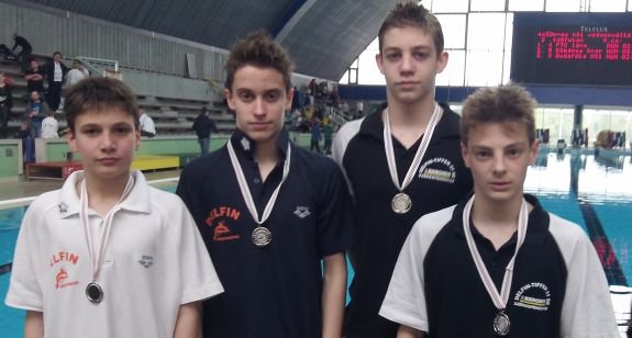 Kasó Gergő, Csanádi Zsombor, Fekete Ferenc, Molnár Márton (a képen balról jobbra) a 4x50 méteres fiú vegyes váltóban ezüstérmet szerzett. Csanádinak ezen kívül két hasonló érem, Feketének pedig egy bronz is jutott, vagyis többször dobogón állhattak a delfinesek. A csapat tagja volt Fekete Kristóf is, aki 15. születésnapját ünnepelte a versenyen, egy hatodik helyezéssel megajándékozva magát. Az összesített pontversenyben korcsoportjában második lett Csanádi Zsombor, harmadik Fekete Ferenc.