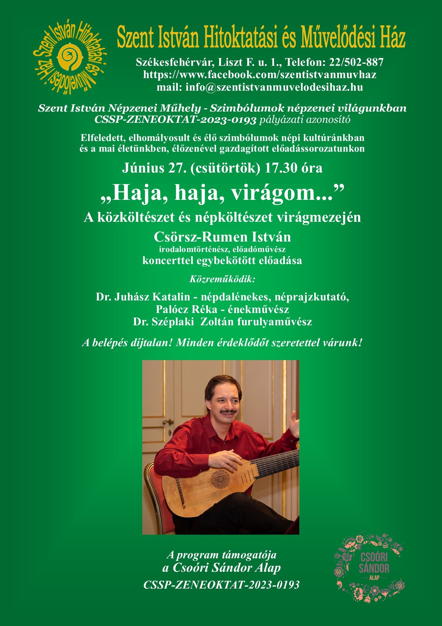 A Szent István Népzenei Műhely – Szimbólumok népzenei világunkban előadássorozat Csörsz-Rumen István irodalomtörténész, előadóművész koncerttel egybekötött, „Haja, haja, virágom…” - A közköltészet és népköltészet virágmezején című előadásával folytatódik.