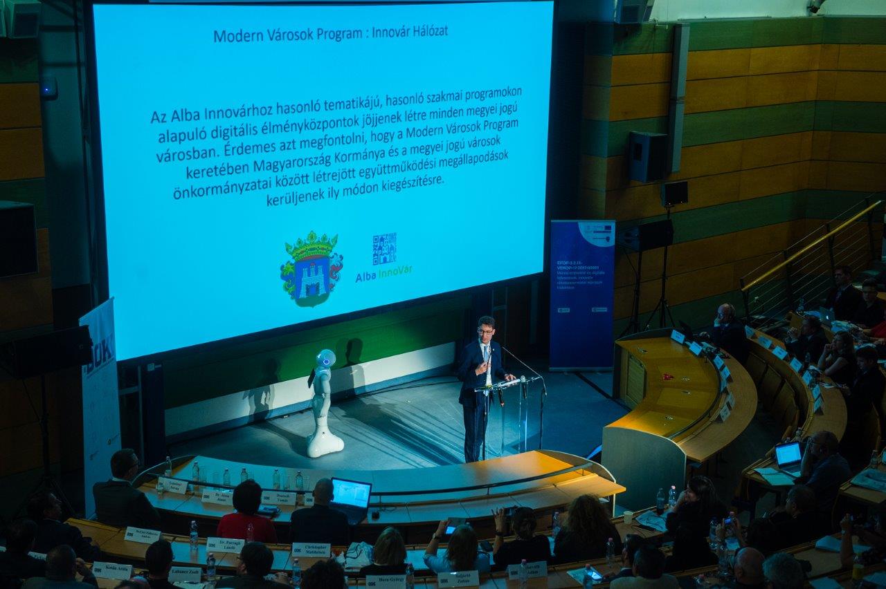 A plenáris előadások között Cser-Palkovics András polgármester mutatta be a székesfehérvári Alba Innovár élményközpontot, amely a digitális készségek egyenlő elsajátítását tűzte ki célul. A bemutatásban segítségére volt Alba, a központ emblematikus kis robotja, szimbolizálva a nyáron elindított, több partnerrel megvalósított együttműködést. Az önkormányzat köznevelésben átalakult szerepe indította el a digitális oktatást érintő felvállalást, egy érzékenyítő, valamint egy pályaorientációs programmal együtt. „A felismerések közül az egyik, hogy a fiataljainknak ezek a területek nem a jövőt jelentik, hanem a mindennapjaikat, az oktatásukat és majd a munkahelyüket is. A helyi gazdasági igény is megfogalmazta felénk ezt az elvárást: Székesfehérvár mint az egyik legnagyobb ipari erővel rendelkező város azt tapasztalja, hogy a vállalatok a munkaerőhiányra a digitalizációval összefüggő megoldásokat választanak, és a robottechnológia nem a jövő, hanem a jelen a város gazdaságában – ebből is fakadt az Alba Innovár létrehozása.” A működés elindításában az IVSZ szakmai programja adott megfelelő szakmai alapot.