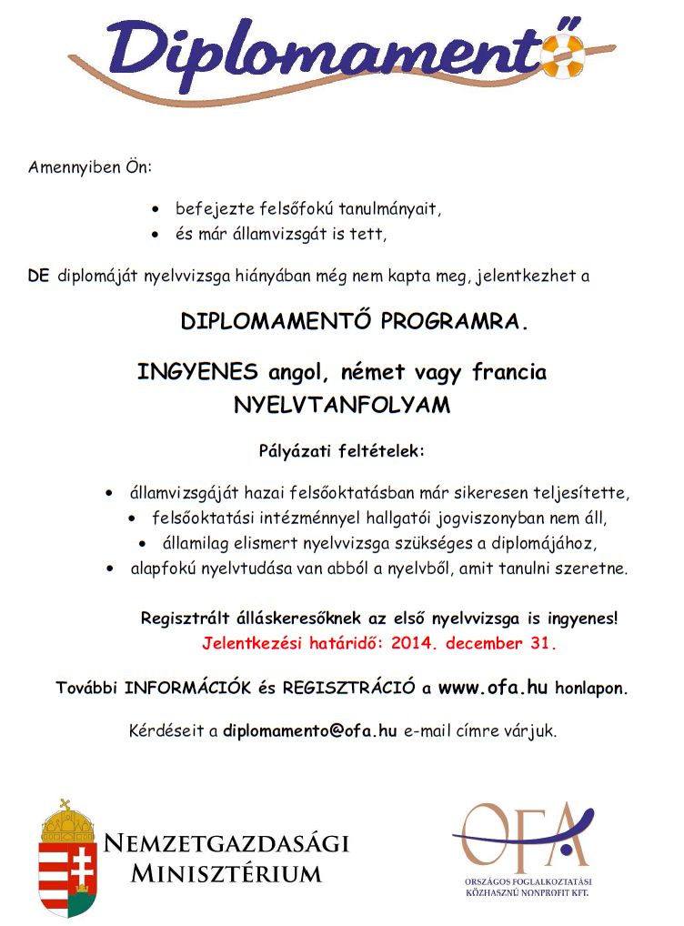 A kormány által támogatott „Diplomamentő” program azoknak szól, akik már sikeresen államvizsgáztak, de diplomájukat nyelvvizsga hiányában még nem kaphatták meg. A képzések többsége angol nyelvű, de indulnak német és kisebb számban francia képzések is. A tanfolyamok kétharmada 240 órás, emellett 120 és 180 órás tanfolyamok is elérhetők.
