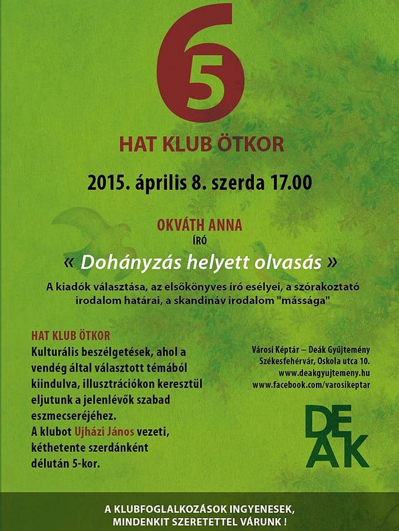 2015. április 8-án, szerda délután folytatódik a Hat Klub Ötkor című program a Városi Képtár – Deák Gyűjtemény- ben. A kulturális beszélgetések alkalmával a vendég által választott témából kiindulva, illusztrációkon keresztül jutnak el a jelenlévők szabad eszmecseréjéhez. A klubot Ujházi János vezeti, hat alkalommal, kéthetente, szerdánként délután 17 órakor. A program ötödik vendége Okváth Anna lesz.