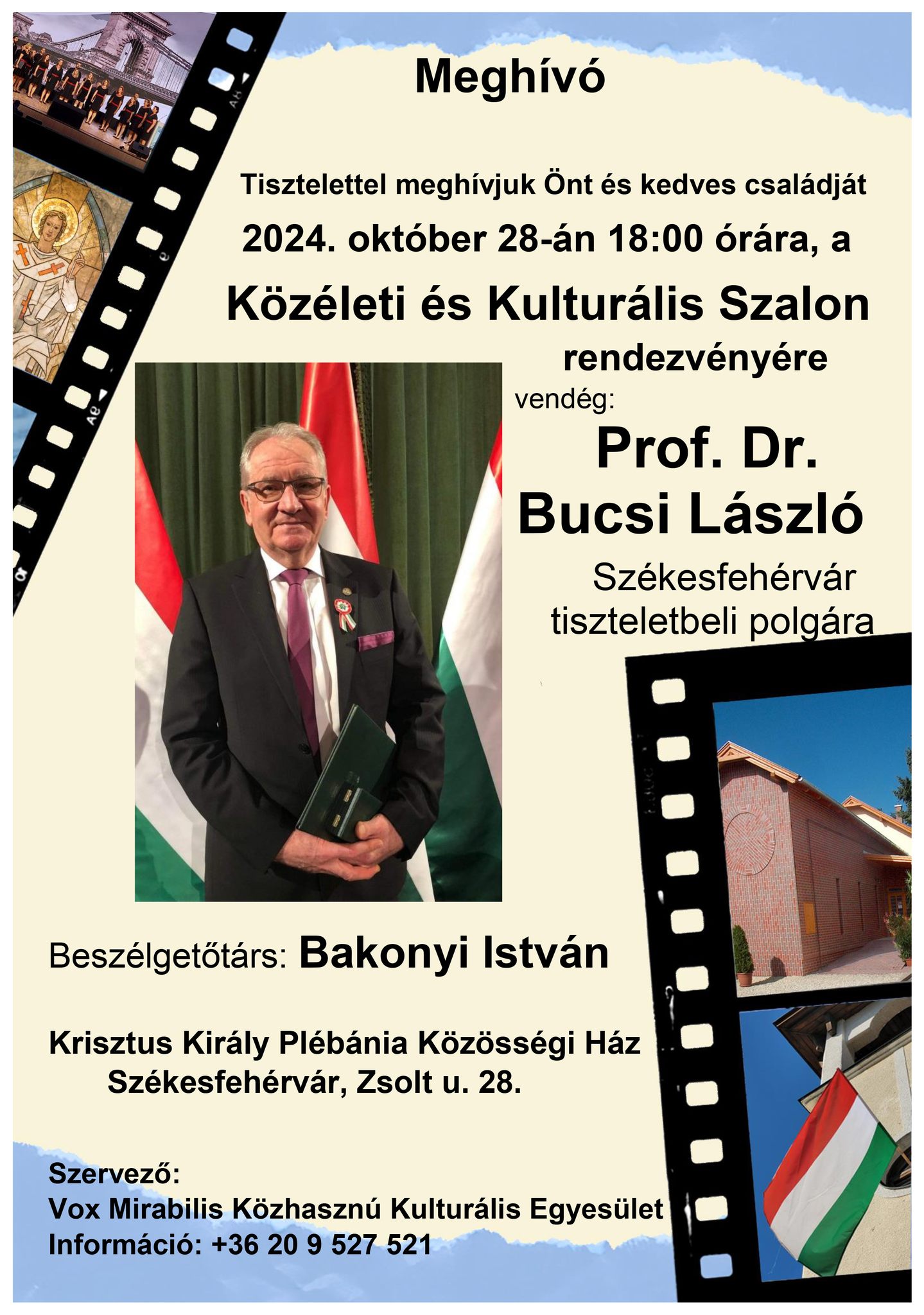 Dr. Bucsi László professzorral beszélget a Közéleti és Kulturális Szalon újabb rendezvényén, október 28-án, hétfőn Bakonyi István. A 18 órakor kezdődő, érdekesnek és tanulságosnak ígérkező beszélgetésnek ezúttal is a Krisztus Király Plébánia Közösségi Ház (Zsolt u. 28.) ad otthont.