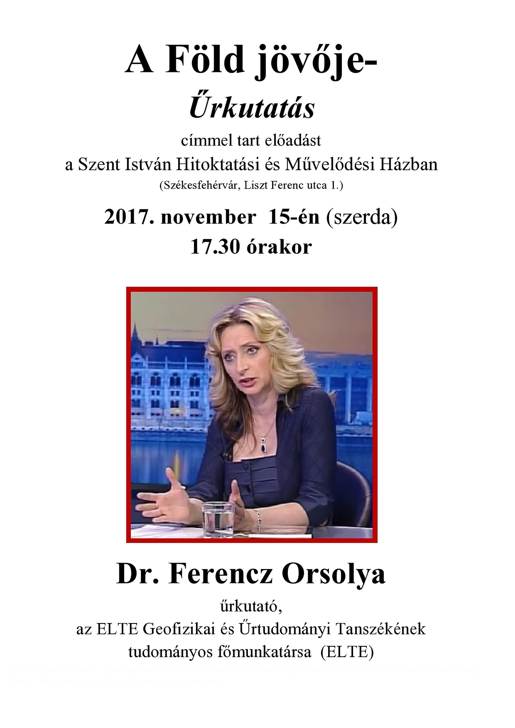 November 15-én, szerdán 17.30 órakor „A Föld jövője - Űrkutatás” címmel tart előadást Dr. Ferencz Orsolya, űrkutató, az ELTE Geofizikai és Űrtudományi Tanszékének tudományos főmunkatársa a Szent István Hitoktatási és Művelődési Házban. A belépés díjtalan, minden érdeklődőt szeretettel várnak.