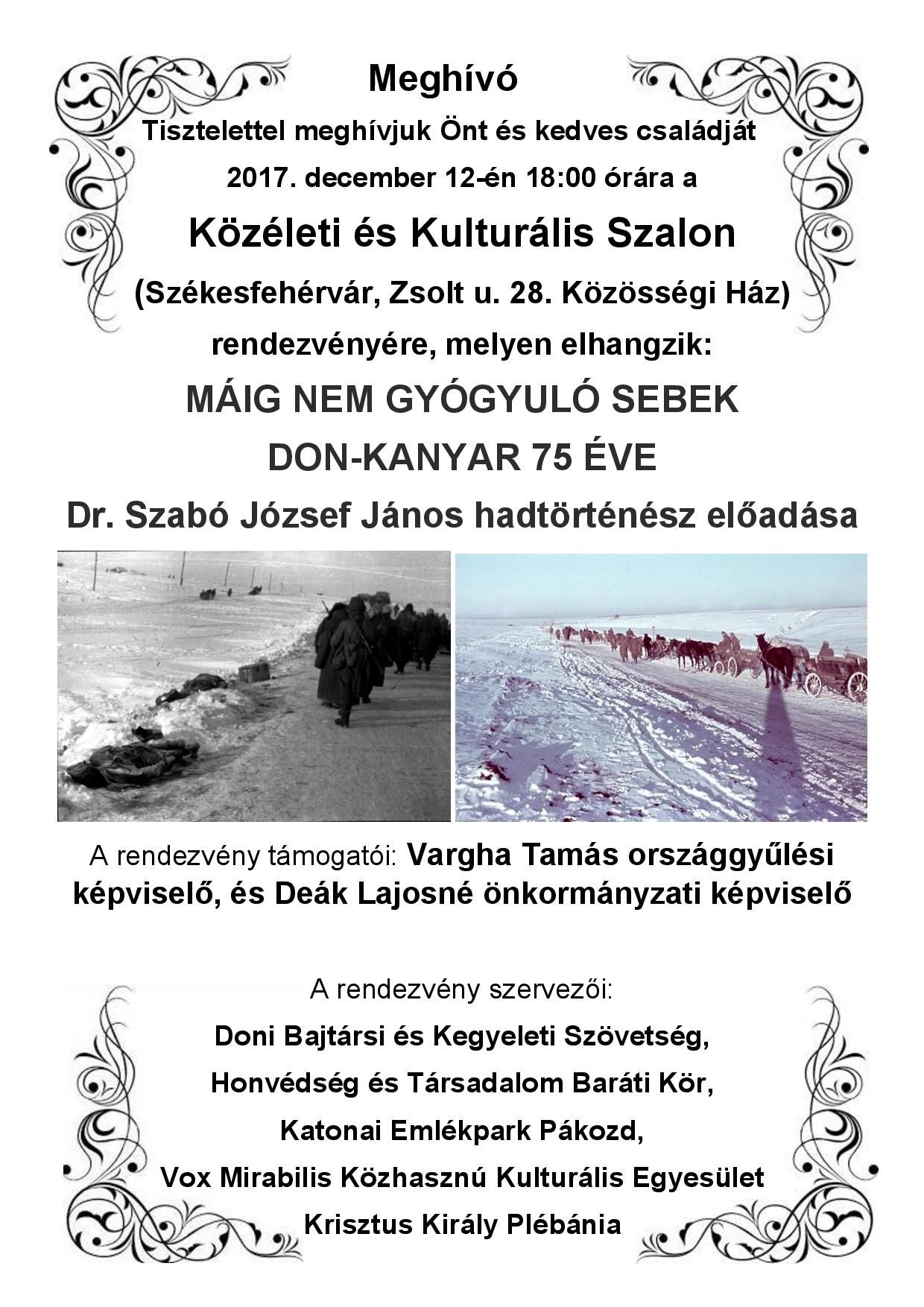 Rendhagyó rendezvénnyel várja az érdeklődőket december 12-én 18 órakor a Közéleti és Kulturális Szalon a Zsolt utcai Közösségi Házban. A Máig nem gyógyuló sebek – a Don-kanyar 75 éve című esemény meghívott előadója Dr. Szabó József János hadtörténész. A rendezvény Vargha Tamás országgyűlési képviselő és Deák Lajosné önkormányzati képviselő támogatásával valósul meg.