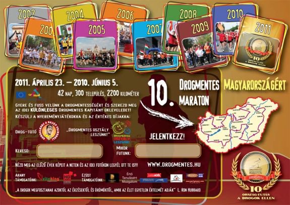 Jubileumához érkezett a Drogmentes Magyarországért Maraton. Idén tizedik alkalommal kerül sor a hatalmas összefogással megvalósuló programsorozatra, mely idén április 23-án kezdődik és június 5-ig tart. Az ország legnagyobb civil szerveződésű rendezvénye áthalad valamennyi megyén, negyvenkét nap alatt háromszáz települést érint és összesen 2.200 kilométer "tesz meg." Székesfehérvárra április 27-én (szerdán) érkezik a maraton, 11.00 órától a Bregyó közben lesznek különféle programok.