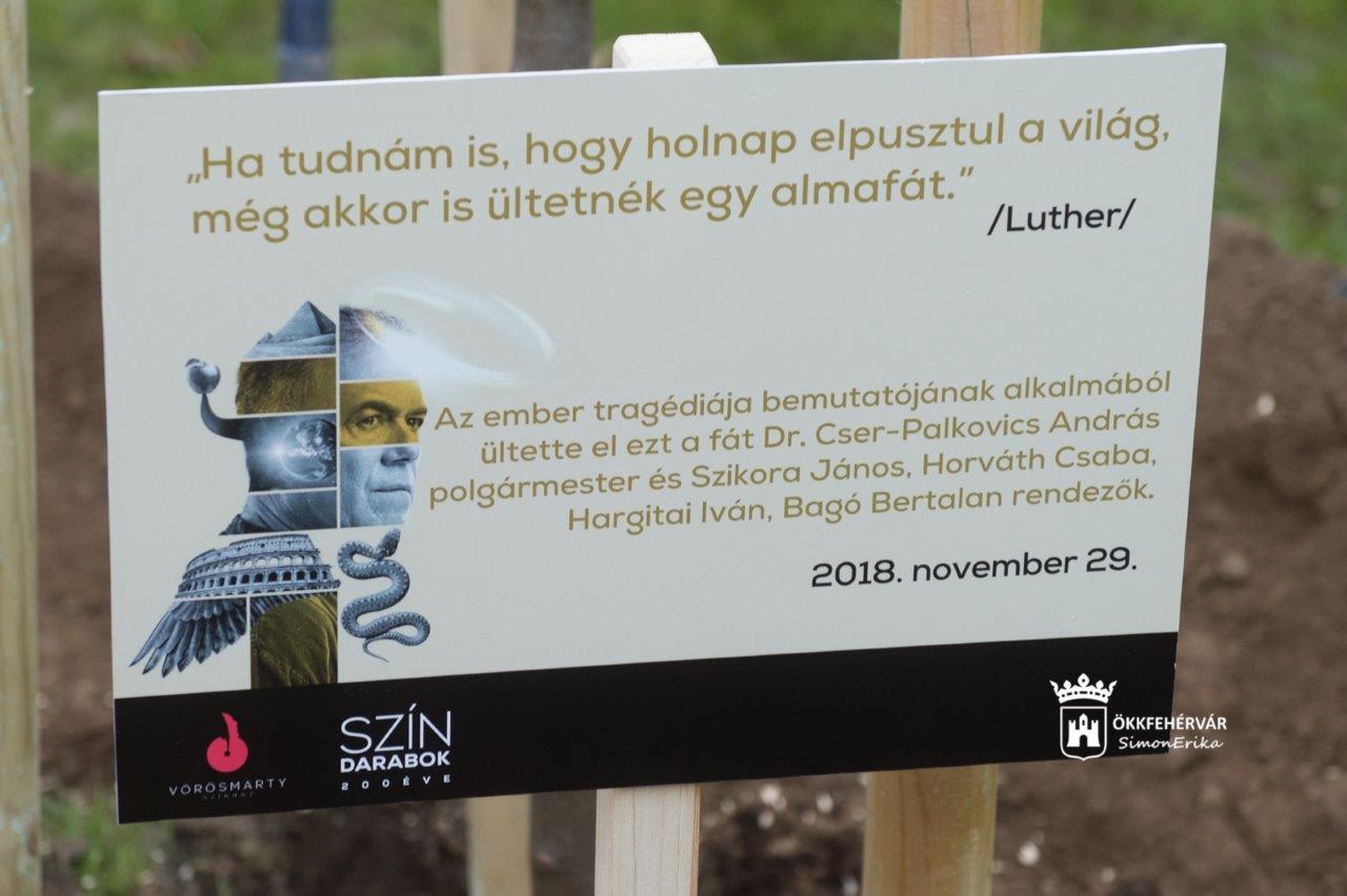 "Amikor mi, színházi emberek darabokat csinálunk, valami hasonlót csinálunk: ültetünk, csak éppen gondolatokat, érzéseket ültetünk el az emberekben." - mondta el a szimbolikus gesztusról Szikora János rendező, a Vörösmarty Színház igazgatója, aki szerint a magyar irodalom egyik legfantasztikusabb és leggazdagabb alkotását készülnek elültetni hamarosan a székesfehérvári nézők szívében és gondolataiban Az ember tragédiája bemutatásával. A gesztus egyben tiszteletadás is annak a városnak, amelynek színházpártoló magatartása 200 éves hagyományra nyúlik vissza.