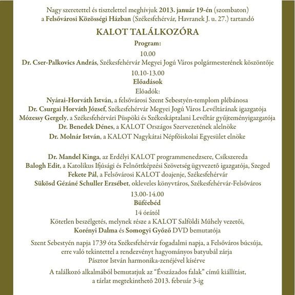 Egész napos program keretében mutatják be a KALOT - a Katolikus Agrárifjúsági Legény- egyesületek Országos Testülete - múltjának tárgyi- és írásos emlékeit egy kiállítás formájában január 19-én a Felsővárosi Közösségi házban. A vértanú ünnepét megelőző napon, KALOT konferenciát szerveznek, melyre meghívják az országban működő KALOT csoportok képviselőit is a Szent István Emlékév keretében.