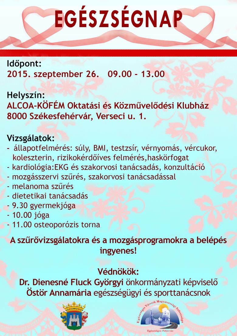 A KÖFÉM Művelődési Házban szeptember 26-án, szombaton 09.00 órától 13.00 óráig tartó egészségnap keretében lehetőség nyílik általános állapotfelmérésre, a testsúly ellenőrzésére, BMI, vagyis testtömeg index számításra, vérnyomás-, várcukorszint-, koleszterinszint-mérésre, rizikókérdőív kitöltésére, szakorvos bevonásával kardiológiai vizsgálatra, mozgásszervi és melanoma szűrésre, dietetikai tanácsadásra, és csontritkulás tornára. Mindeközben 09.30 órától a gyerekeknek, 10.00 órától a felnőtteknek nyílik lehetőségük a jóga kipróbálására.