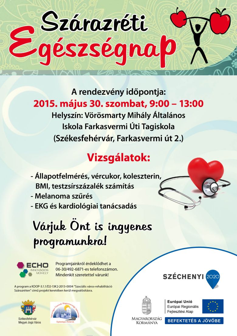 Május 30-án szombaton újabb egészségnapot rendeznek Szárazréten, a Vörösmarty Mihály Általános Iskola Farkasvermi úti Tagiskolájában. A programok reggel 9 órától 13 óráig tartanak, a résztvevők számos ingyenes vizsgálaton vehetnek részt, többek között koleszterin, vércukor és testzsírszázalék mérés lesz és melanoma szűrést is rendeznek.
