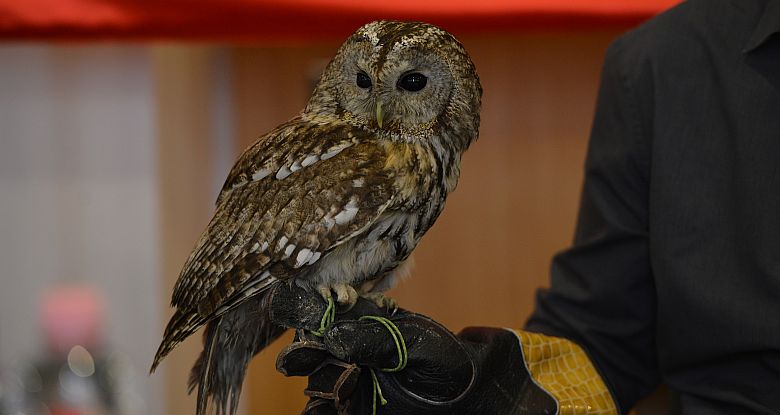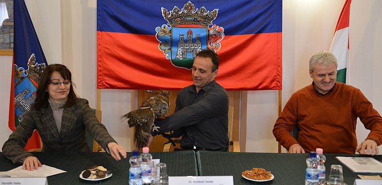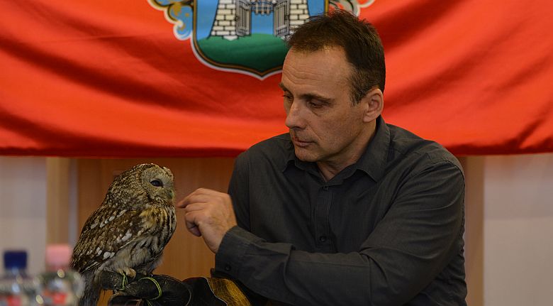 Berkényi Tamás a Vadmadárkórház vezetője egy fél szemére vak, de repülni tudó macskabaglyot is hozott a sajtótájékoztatóra.
