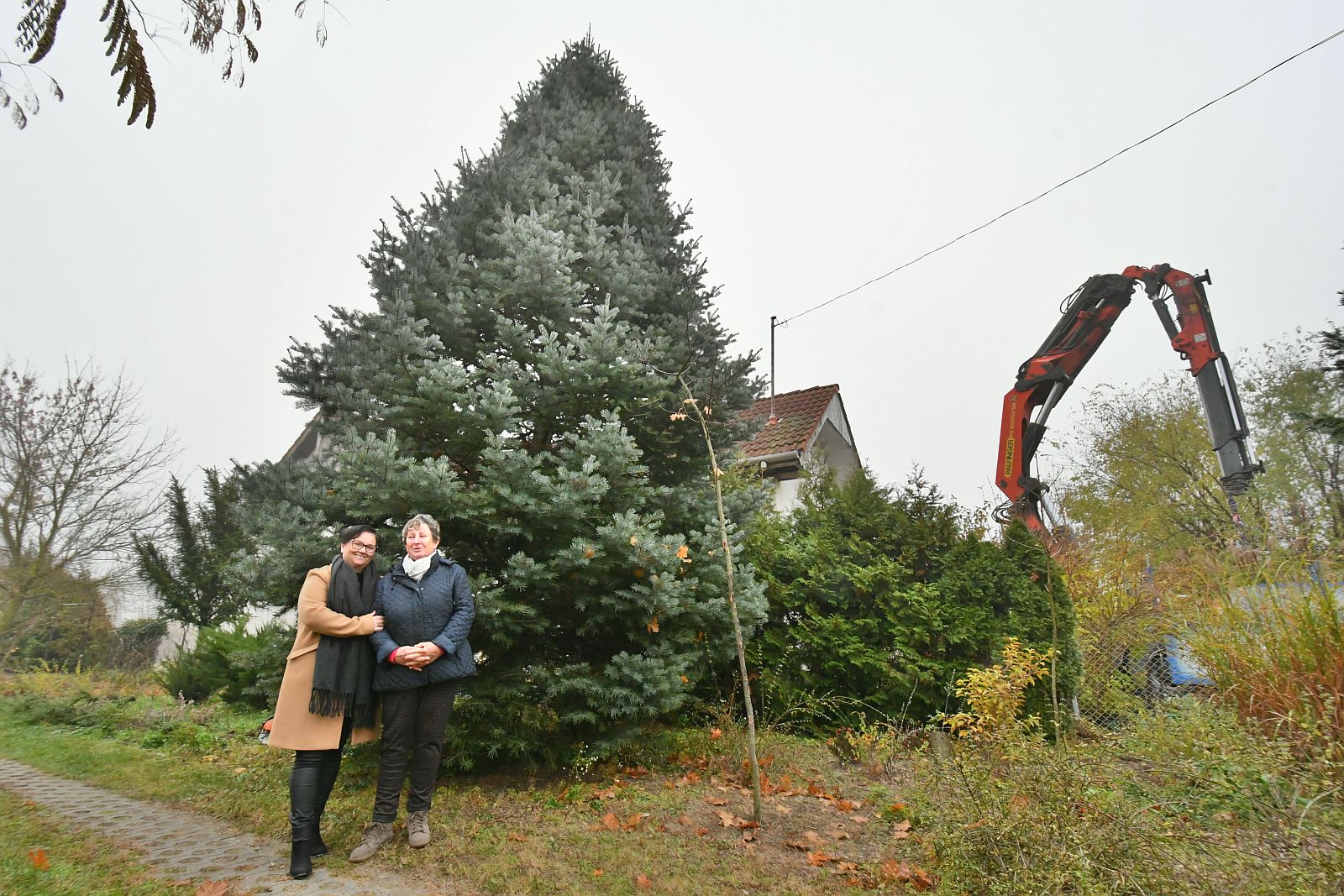Teherautó, daruskocsi és városgondnoksági autók érkeztek hétfőn reggel a feketehegy-szárazréti Ipoly utcába, ahol Menyhártné Szabó Katalin, Szontaghné Kovács Erika, a körzet önkormányzati képviselője, valamint Törő Gábor országgyűlési képviselő éppen azt latolgatták, miként fogják majd a szakemberek kiemelni a helyéről azt a terebélyes fenyőt, amelyet tulajdonosa felajánlott Székesfehérvár számára, hogy advent idején örömöt, ünnepi hangulatot hozzon a belvárosban sétálók mindennapjaiba.