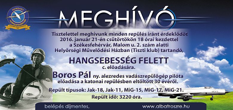 Igazi kuriózumnak ígérkezik az Albatrosz Repülő Egyesület holnapi előadása, amire a Helyőrségi Művelődési Házban kerül sor este hat órakor. A repülés szépségéről, valamint a különböző bevetéseiről Boros Pál ny. alezredes vadászrepülőgép pilóta tart előadást. Az általa katonaként, levegőben eltöltött harminc év során valószínűleg volt része izgalomban bőven. Azokkal, akik ellátogatnak csütörtökön este a Tiszti Klubba, biztosan megosztja ezen élményeit. Az összesen 3220 órát repült pilóta előadásának a címe: Hangsebesség felett.
