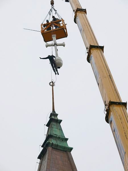 A Szent Imre templom tornyának felújított keresztjét ma délben emelték vissza a helyére. A látványos "alpinista akcióra" sokakat állított le a Városház téren. A mintegy három méteres keresztet május elején emelték le a helyéről és Ócsai Sándor műhelyében aranyozták újra. A felújításra azért volt szükség, mert az utóbbi időben több vihar is megrongálta a "Barátok templomának" tetejét és a keresztet tartó császárfa is meggörbült.