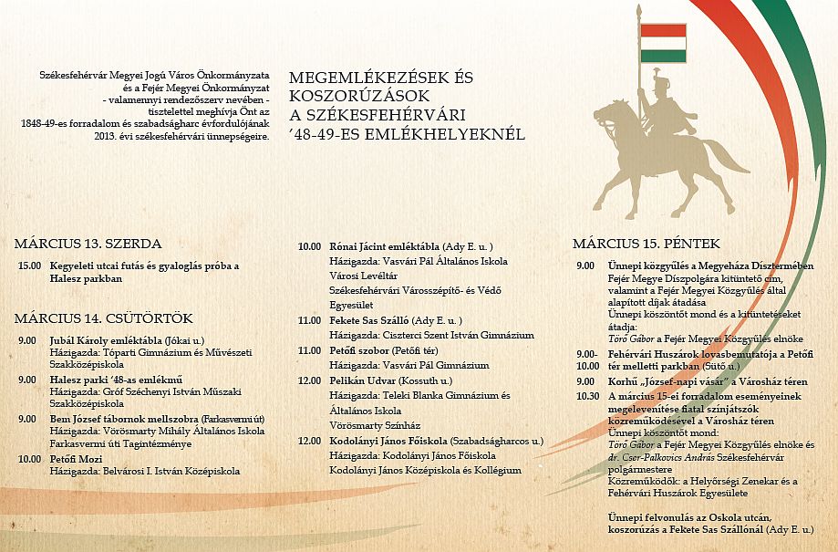 Cser-Palkovics András polgármester is szeretettel invitálta a fehérváriakat az ünnepségre. Azt tapasztaltuk az előző két évben, hogy megmozdultak a fehérváriak és bízom abban, hogy az időjárástól függetlenül sokan jönnek majd el az ünnepen. Igazi családi program lesz a rendezvény, melyre szeretettel hívunk mindenkit! Legyünk minél többen és csatlakozzunk a belvárosban megelevenedő forradalmi eseményekhez - mondta.