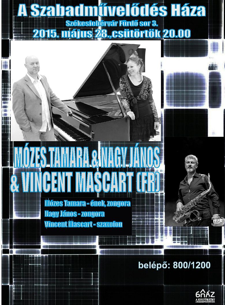 Mózes Tamara, Nagy János és Vincent Mascart közös produkcióját láthatják az érdeklődők A Szabadművelődés Háza színpadán május 28-án, csütörtökön este 20 órától. A különleges formáció igencsak tág teret nyújt a zenei ötleteknek, hiszen két billentyűből, énekhangból és szaxofonból áll. Műsoruk saját szerzeményekből és sztenderdekből áll, sok improvizációval.