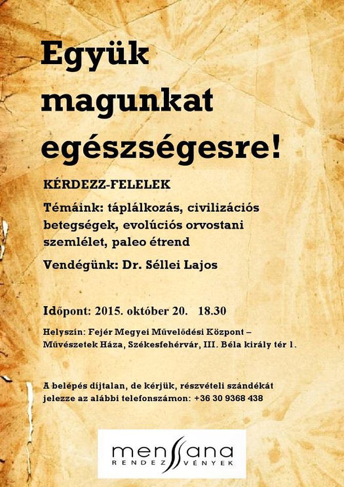 Október 20-án kedden 18.30- tól a Művészetek Háza lila termében hallhatnak előadást az érdeklődők a táplálkozásról, civilizációs betegségekről és az evolúciós orvostani szemlélet témaköreiről. Az előadó Dr. Séllei Lajos az evolúciós orvostani szemlélettel még külföldön ismerkedett meg, hazánkban ez az irány mint paleolit táplálkozás válik egyre népszerűbbé.