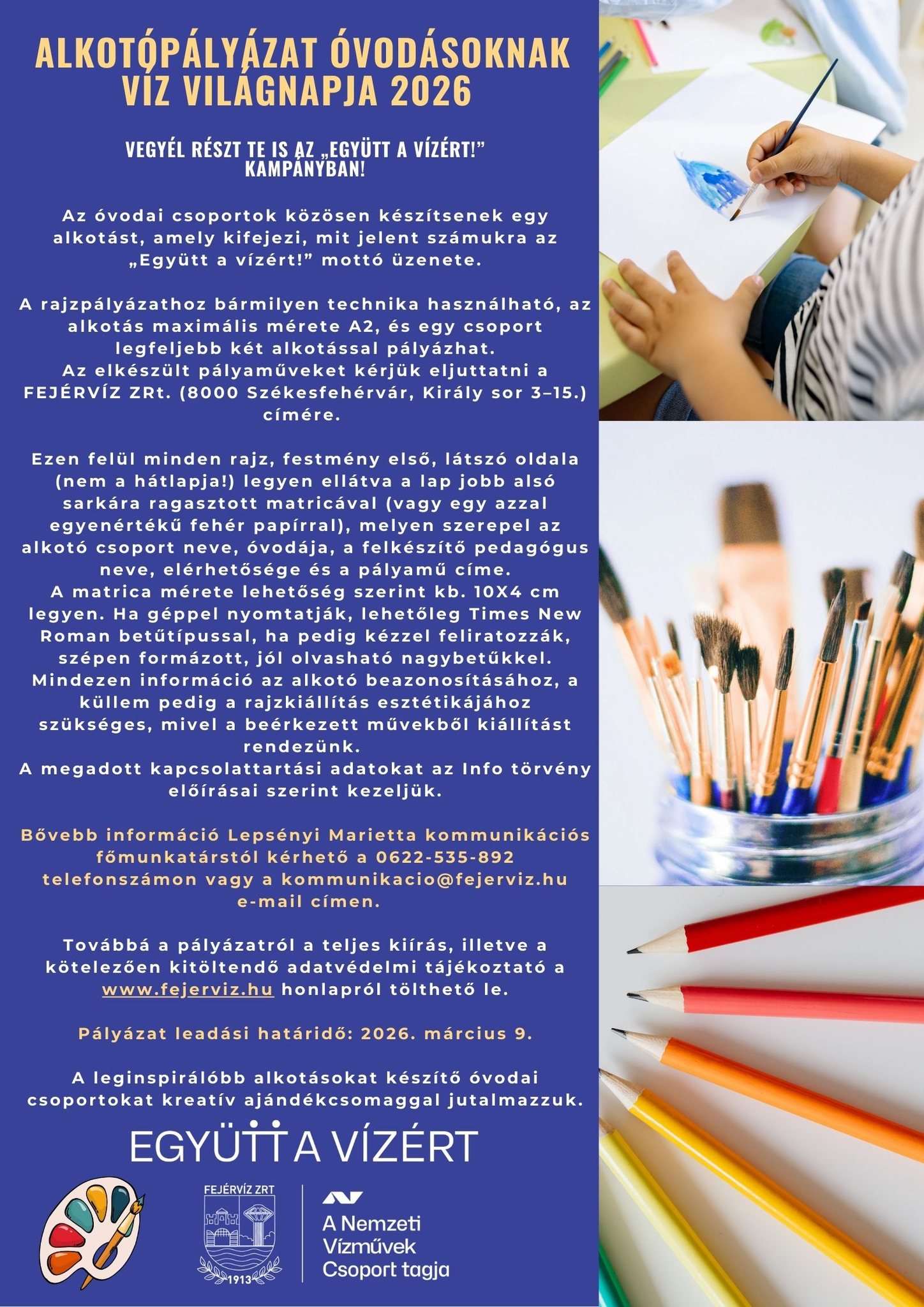 Óvodai csoportoknak hirdetett rajzpályázatot a Fejérvíz Zrt. a Víz Világnapja tiszteletére. A közös alkotáson azt kell ábrázolniuk, hogy a pályázat mottója – Együtt a vízért! – mit jelent számukra. A gyerekek szabadon választott technikával dolgozhatnak, a beadási határidő 2026. március 9. A leginspirálóbb rajzok készítői ajándékot kapnak.
