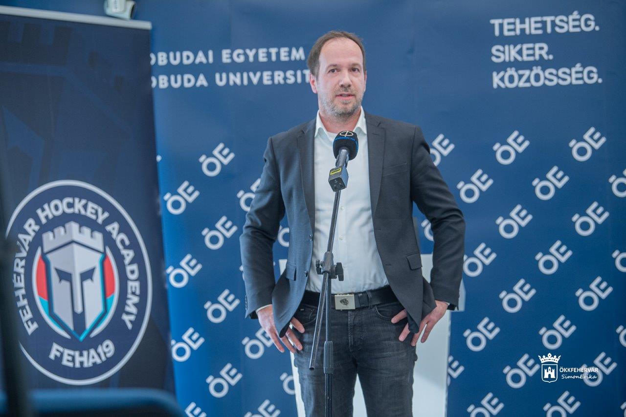 Fekti István, az Ifj. Ocskay Gábor Jégkorong Akadémia Nonprofit Kft. ügyvezetője arról beszélt, miért fontos az akadémia életében az aláírt együttműködés. Elmondta, hogy 2021 júliusa óta államilag elismert sportakadémiaként és módszertani központként működnek, egyedüliként rendelkeznek Erste Ligás felnőtt csapattal, ennek megfelelően azonban a csapat 75%-át U23-as játékosok kell, hogy alkossák. „Rengeteg útját kereső fiatalemberrel dolgozunk, és nekik kell valamilyen mankót szereznünk a hónuk alá, hiszen nem mindenkinek lesz az élsport a mindennapi megélhetése. Gondoskodnunk kell, azonban ez óriási a felelősség is.” – fogalmazott az ügyvezető, aki több jó példát is felhozott, hogy igenis lehetséges az élsportot összeegyeztetni a tanulással, és akár magas szintű jégkorong mellett is részt tudnak venni a fiatalok a felsőoktatásban.