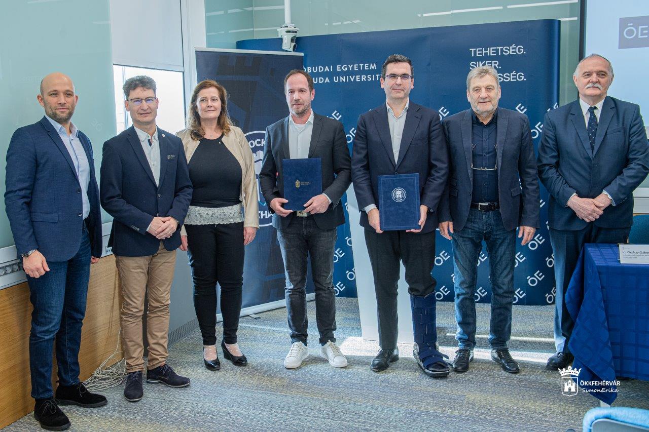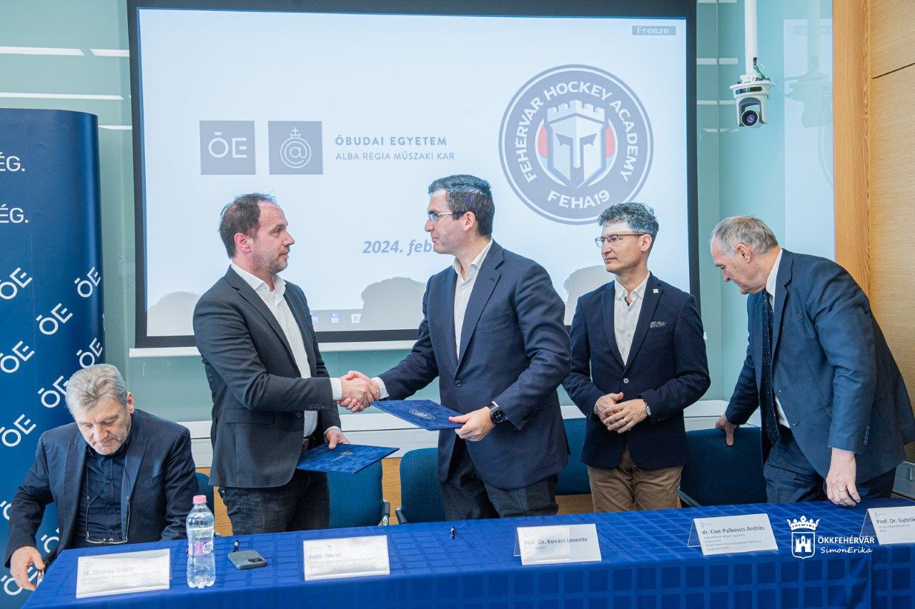 Az ünnepélyes aláíráson részt vett dr. Cser-Palkovics András polgármester, Prof. Dr. Kovács Levente, az Óbudai Egyetem rektora, Prof. Dr. Györök György dékán, valamint az Ifj. Ocskay Gábor Jégkorong Akadémia Nonprofit Kft. részéről Fekti István ügyvezető és id. Ocskay Gábor kuratóriumi elnök. Dr. Cser-Palkovics András polgármester gratulált Prof. Dr. Kovács Leventének, akit nemrég választottak meg újabb 5 évre az Óbudai Egyetem élére. A polgármester emlékeztetett, hogy az Óbudai Egyetem az elmúlt években milyen sokat tett a városért. Segített megmenteni és itt tartani Fehérváron a geoinformatikai képzést, átvette a Corvinus épületeit, valamint tett azért, hogy a Sportközgazdász képzés is a városban maradjon – összegezte dr. Cser-Palkovics András. „A cél, hogy olyan stratégiai partnerek csatlakozzanak ehhez a munkához, akik egy-egy területen tudnak pluszt adni az egyetemnek. Erősítsük a sport és a tudomány kapcsolatát, hiszen amerre tart a világ, ez egyre inkább fontossá válik.” – fogalmazott a városvezető, majd hozzátette, hogy nem csak az utánpótlásban és a sporttudományban lehet fontos a mostani együttműködés, hanem akár újabb célokat, hosszútávú jövőképet is adhat a sportolóknak.