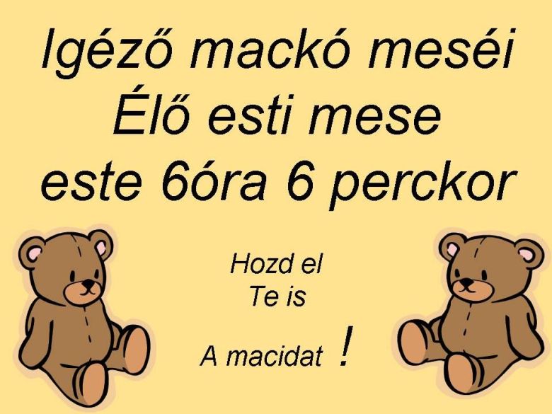 Élő esti mesével várják a gyerekeket Székesfehérvár új multikulturális terében, az Igézőben minden hétköznapon. Hétfőtől péntekig, este 6 óra 6 perctől Igéző Mackó történeteit hallgathatják a kicsik a Basa utca 1. szám alatt. A meséket figyelemmel kísérhetik a Basa utca 1. szám alatti helyiségben, illetve a hangosításnak köszönhetően akár az utcán is. A programon való részvétel ingyenes.