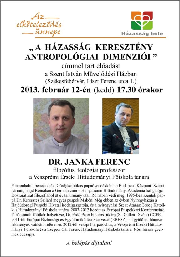 Dr. Janka Ferenc, filozófus, teológiai professzor tart előadást február 12-én kedden 17.30 órától a Szent István Művelődési Házban.A Házasság Hete alkalmából meghirdetett előadás címe: "A Házasság keresztény antropológiai dimenziói". A programra a belépés ingyenes. Dr. Janka Ferenc a Veszprémi Érseki Hittudományi Főiskola és a szegedi Gál Ferenc Hittudományi Főiskola tanára. Nős, három gyermek édesapja.