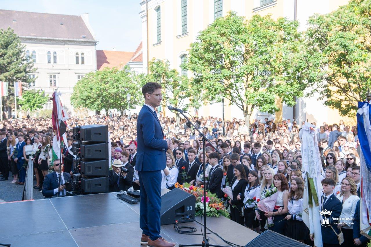 A közel kétezer végzőst a város nevében dr. Cser-Palkovics András köszöntötte és búcsúztatta, aki kiemelte, az egyik kedvenc ünnepsége a városi ballagás, fantasztikus látványt nyújt a a sok fiatal Székesfehérvár gyönyörű, történelmi főterén. A polgármester felidézte, sok évtizedes, talán az országban is egyedülálló rendezvény a közös ballagás, és könnyen lehet, hogy aki most ballag, annak az anyukája vagy apukája is ugyanúgy itt állt korábban egy városi ballagáson, és a remények szerint sokaknak a gyermeke is ugyanígy, ugyanitt búcsúzik majd középiskolai tanulmányaitól. „Bízom benne, hogy ezek a középiskolás évek önöknek, nektek sok élményt, sok értéket is tartogattak, sok barátság, sok olyan emberi kapcsolat született, ami majd évtizedek múlva is élni fog. Bízom abban is, hogy az értékek mellett azt a tudást is megkapták, hogy akár az érettségi, akár a szakmai vizsga következzék, sikeresek tudnak majd lenni!” – bíztatta a nagy megmérettetés előtt állókat dr. Cser-Palkovics András. Hozzátette, biztos abban, hogy amiként a dal szól, mindenkiben ott vannak az álmok, a megvalósítandó célok: miért félnénk, miért élnék, ha nem egy álomért? „Azt kívánom, hogy érjék, érjétek el az álmaitokat, s ha lehet, minél többen közületek ezt itt, Székesfehérváron tegyétek meg. És hogyha máshova mentek, akkor minél többször térjetek vissza Székesfehérvárra, mert ez a város a ti városotok!"