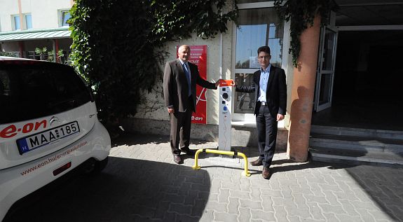 „Energia új utakon” mottóval indította el fenntarthatósági programját az E-ON Hungária Zrt, hogy elősegítse az elektromos hajtású közlekedés fejlődését. A projekt újabb állomásaként Székesfehérváron, a Jancsár Hotel udvarán avattak elektromos töltőpontot, melyet év végéig térítésmentesen használhatnak az autósok. Az átadáson a város polgármestere kipróbálta az elektromos járművet és bejelentette: megvizsgálják, hogy miként tudnák kedvezményekben részesíteni a környezetkímélő autóval közlekedőket.