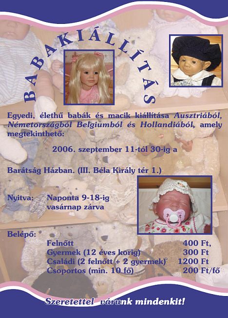 Babakiállítás nyílik ma a Barátság Házában, ahol egyedi, élethű babákat és macikat lehet megnézni. A babák Ausztriából, Németországból, illetve Hollandiából érkeztek és szeptember 30-ig láthatók. A kiállítás vasárnap kivételével reggel 9 és este 6 között tekinthető meg.