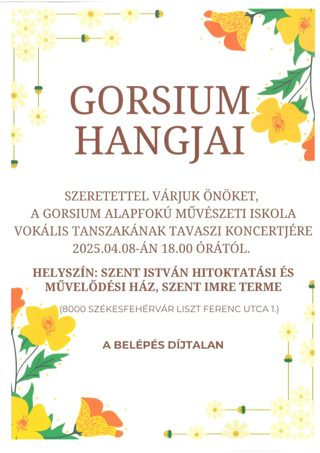 A 18.00 órakor kezdődő program lesz a Gorsium Alapfokú Művészeti iskola Vokális Tanszakának tavaszi fellépése. A belépés mindkét eseményre ingyenes, azonban támogatásokat elfogadnak.