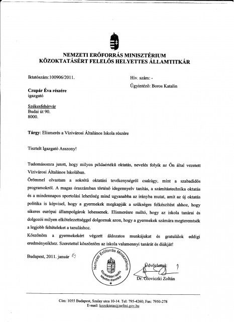 Dr. Gloviczki Zoltán szavai szerint a minőségi munka összhangban van az új oktatáspolitika írányelveivel. Azt írta: "A gyerekek megkapják a szükséges felkészítést ahhoz, hogy sikeres európai állampolgárok lehessenek. Elismerésre méltó, hogy az iskola tanárai és dolgozói milyen elkötelezettséggel dolgoznak azon, hogy a gyerekek számára megteremtsék a legjobb feltételeket a tanuláshoz." A helyettes államtitkár levele végén megköszönte az áldozatos munkát és gratulált az elért eredményekhez. A Vízivárosi Iskola igazgatónője, Czupár Éva egy nevelőtestületi értekezleten olvasta fel az elismerő szakavat kollégáinak, akik jóleső érzéssel fogadták a gratulációt.