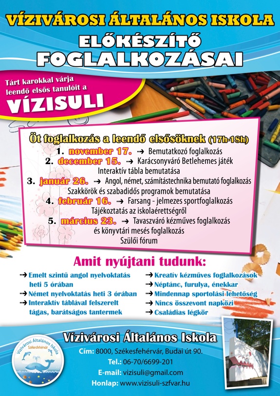 November 17-i kezdettel öt előkészítő foglalkozást tart a leendő elsősöknek a Vízivárosi Általános Iskola. Az idei évben két rendezvényre kerül sor, az első, bemutatkozó foglalkozást követően karácsonyváró betlehemes játékra várják az óvodásokat és bemutatják az interaktív táblát is. Az iskola kreatív kézműves foglalkozásokkal és mindennapos sportolási lehetőségekkel várja szeptembertől a kisdiákokat.