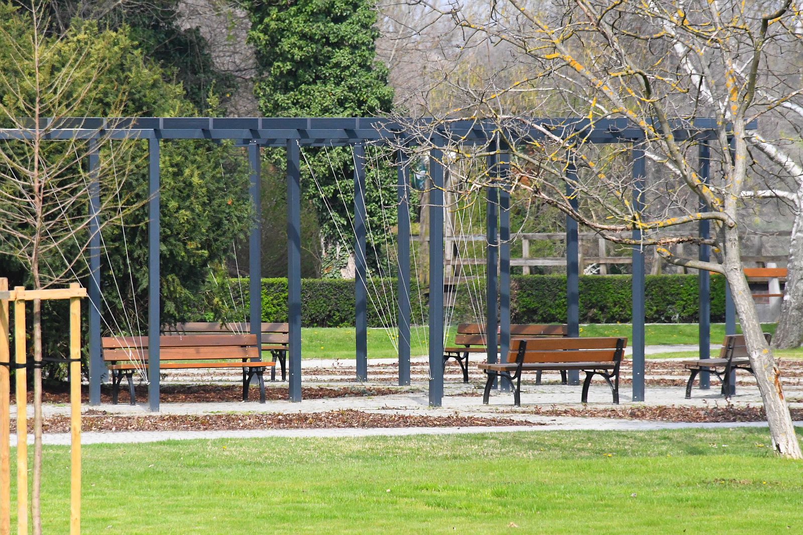 Futórózsákat is ültettek parkban az új, időjárásálló pergolák alatt, amik nyár végére szépen elkezdik majd benőni az új támrendszert.