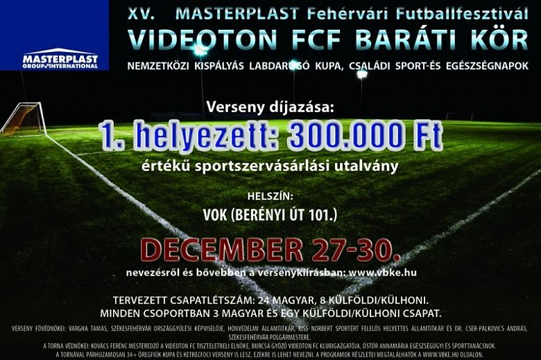 A XV. Masterplast Fehérvári Futballfesztivál, vagyis a Videoton Baráti Kör által szervezett kispályás labdarúgó kupa idén is több részből áll, már december 27-én pattogni fog a labda a VOK-ban. A szervezők ezúttal önálló öregfiúk-tornát is hirdettek, a 34 évnél idősebb játékosok ezen, de ezzel párhuzamosan a hagyományos tornán is részt vehetnek. December 27-től minden nap lesz program, elsőként az öregfiúk-torna résztvevői játszanak. Erre az 1980. január 1. után születettek nevezhetnek, de ha valaki kellő erőt érez magában, párhuzamosan a "nagy" tornán is részt vehet. A VOK-ban a négy nap alatt lesz négycsapatos női focikupa (28-án) és szintén négycsapatos U-10-es gyerektorna (29-én). A Vidi UEFA-kupa-menetelésének emlékére 29-én egy gálameccset rendeznek.