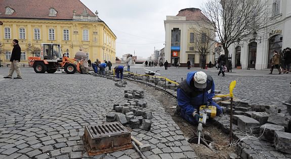 A Városház téren elkezdődött a kockakő burkolat felújítása. A kivitelező járhatóbbá teszi és újrafugázza nem csak a téren, hanem a Liszt Ferenc utcában is több mint 5000 négyzetméteren a már meglévő kiskockakő burkolatot, melynek a hibajavítása is megtörténik. A szakemberek először a csatornalefolyók szintjét állítják be, majd a kis kockakövek újraszintezése után a fugaként használt sódert kiporszívózzák és egy speciális műgyantás fugázó anyaggal rakják újra.