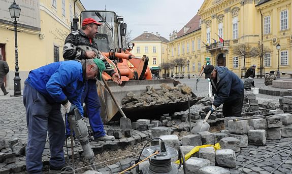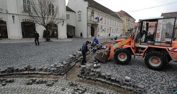 A Városház téren elkezdődött a kockakő burkolat felújítása. A kivitelező járhatóbbá teszi és újrafugázza nem csak a téren, hanem a Liszt Ferenc utcában is több mint 5000 négyzetméteren a már meglévő kiskockakő burkolatot, melynek a hibajavítása is megtörténik. Ezen a részen az ivóvíz és szennyvíz rekonstrukció már korábban elkészült. A szakemberek először a csatornalefolyók szintjét állítják be, majd a kis kockakövek újraszintezése után a fugaként használt sódert kiporszívózzák és egy speciális műgyantás fugázó anyaggal rakják újra.