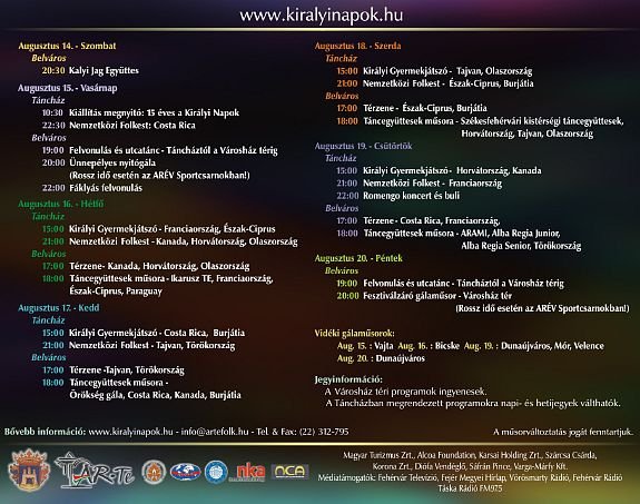 Augusztus 15. és 20. között tizenötödik alkalommal rendezik meg a Királyi Napokat Székesfehérváron. Idén mintegy 110 program várja a látogatókat a fesztivál a Városház téren és a Táncházban. A Városház téri programok természetesen ingyenesek! A Táncházban megrendezett programokra napi és kedvezményes heti jegyek válthatók.