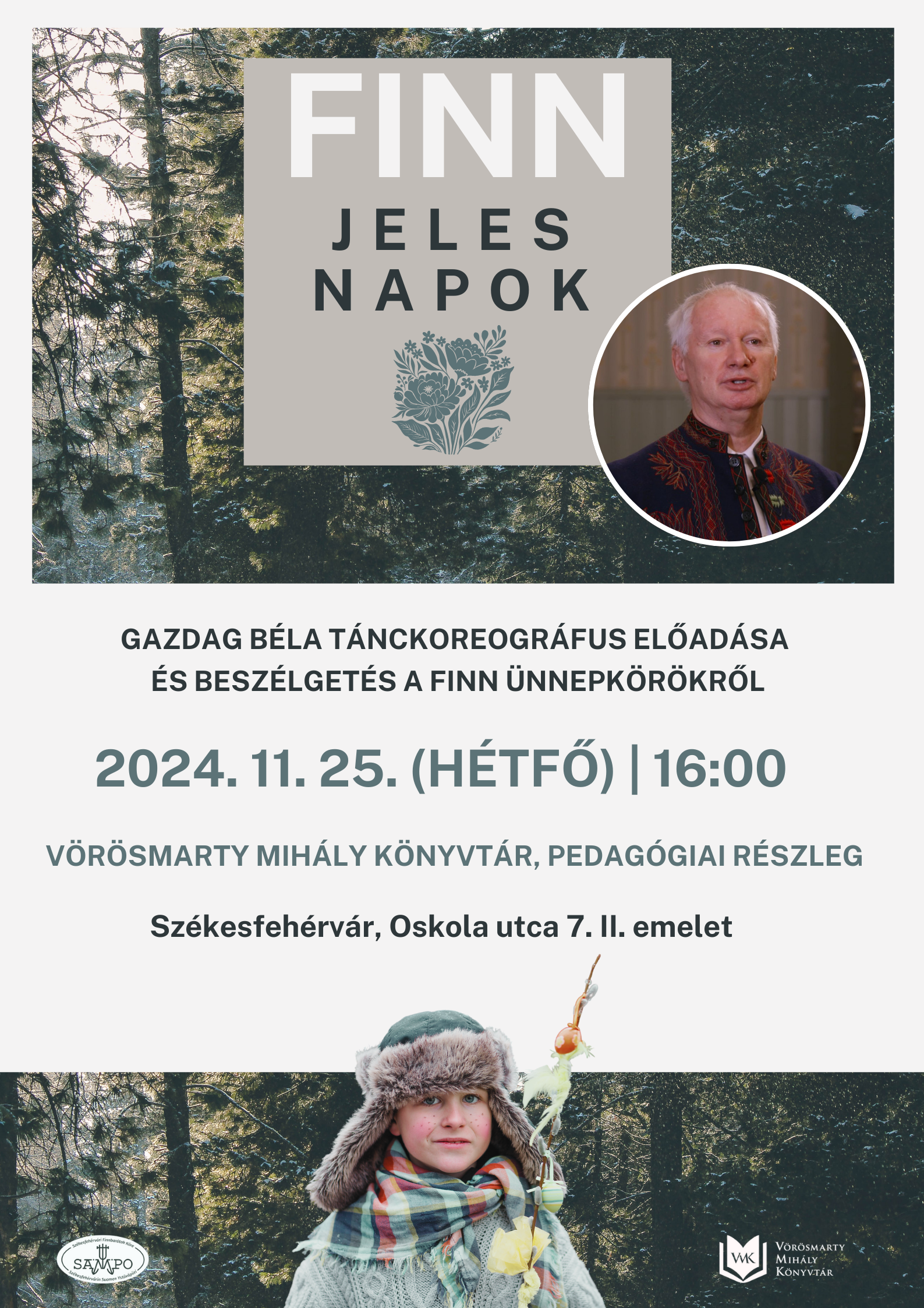 November 25-én, hétfőn 16.00 órakor Gazdag Béla tánckoreográfus tart előadást a finn ünnepkörökről, szokásokról a VMK Pedagógiai Részlegén. Az előadó a rendszerváltásig néptáncosként sok országot bejárt, egyebek mellett így jutott el Finnországba, ami rabul ejtette őt. Később magánúton is kiutazott, kinti barátai néptáncos kurzust szerveztek számára. Hivatalos meghívást és munkavállalói engedélyt is kapott. Mindkét előadásra ingyenes a belépés, szeretettel várják az érdeklődőket!